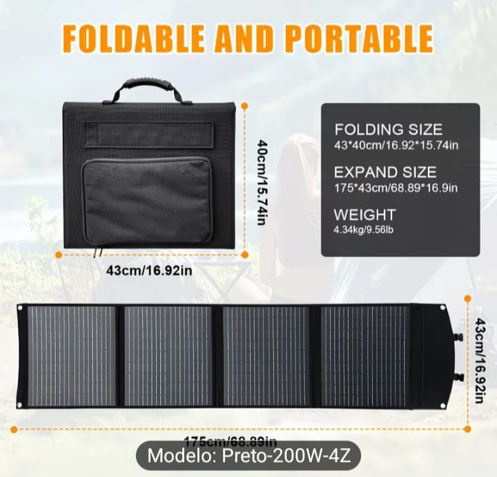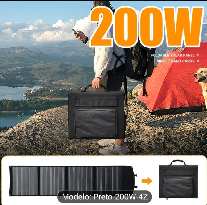 Painel Solar Monocristalino Dobrável de 200W | Saída DC 5V-18V, Interface USB QC 3.0, Design Portátil e Dobrável, Ideal para Campismo, Autocaravanas, Viagens e Carregamento de Telemóvel a Energia Solar